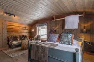 Holzpanele an den Wänden und ein Blocktisch aus dem lokalen Wald, Elch- und Rentiergeweihe. Sitzgruppe mit warmen Wildschafsfellen und guter Leselampe. Haben Sie eine Almsuite gebucht, ist der Zugang zu Whirlpool und Saunas in der Kultursauna inklusive.