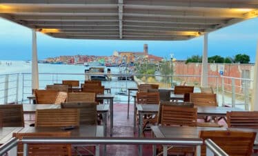 > Ein Sonnendeck mit Sitzplätzen und festen Markisen.